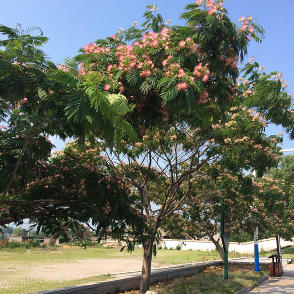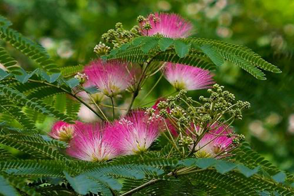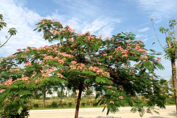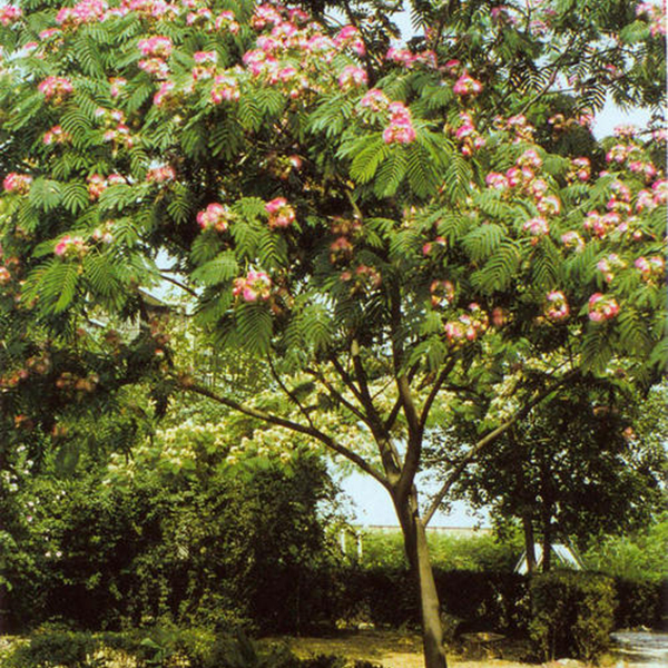 合歡(Albizia julibrissin Durazz.),又名絨花樹,馬纓花。落葉喬木,夏季開花,頭狀花序,合瓣花冠,雄蕊多條,淡紅色。莢果條形,扁平,不裂。高4-15米。樹冠開展;小枝有棱角,嫩枝、花序和葉軸被絨毛或短柔毛。托葉線狀披針形;頭狀花序于枝頂排成圓錐花序;花粉紅色;花萼管狀,花期6-7月;果期8-10月。