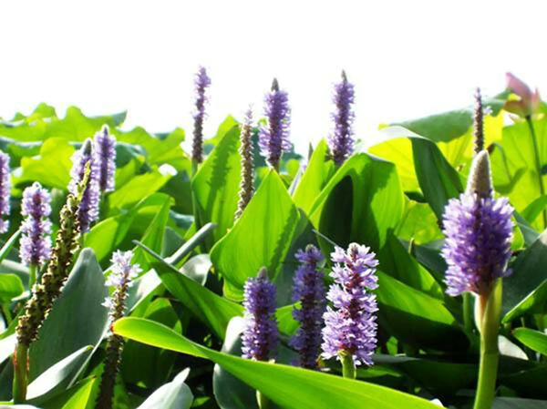 再力花(學名:Thalia dealbata Fraser):竹芋科,再力花屬多年生挺水草本植物。葉卵狀披針形,淺灰藍色,邊緣紫色,長50厘米,寬25厘米。復總狀花序,花小,紫堇色。全株附有白粉。